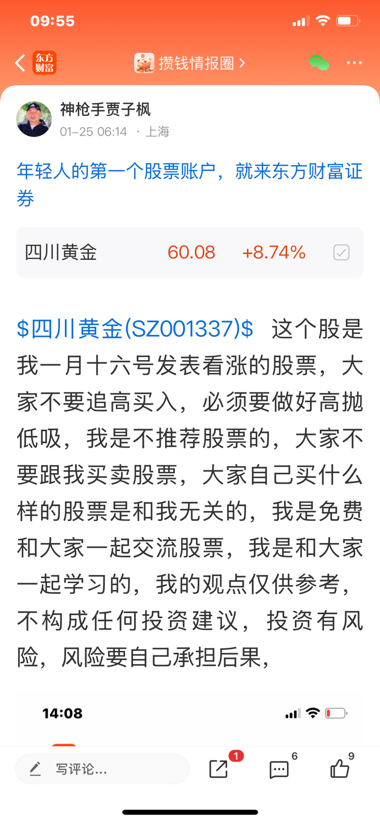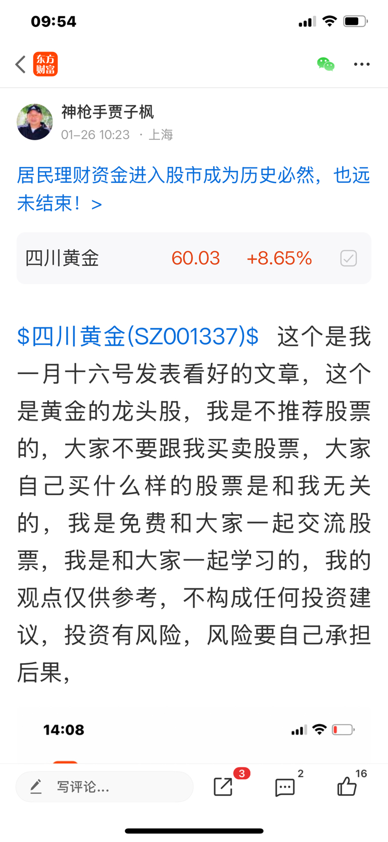 $四川黄金(SZ001337)$ 这个股我是一月十六号发表文章看涨的股票,大家可以看我当时的帖子,我是不推荐股票的,大家不要跟我买卖股票,大家自己买什么样的股票是和我无关的,因为我是免费和大家一起交流股票,我是和大家一起学习的,我的观点仅供参考,不构成任何投资建议,投资有风险,风险要自己承担后果,