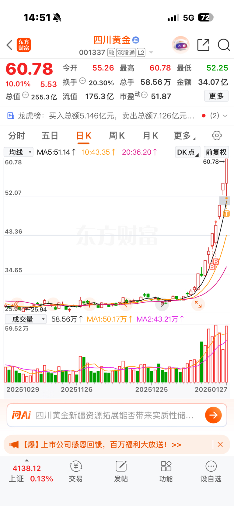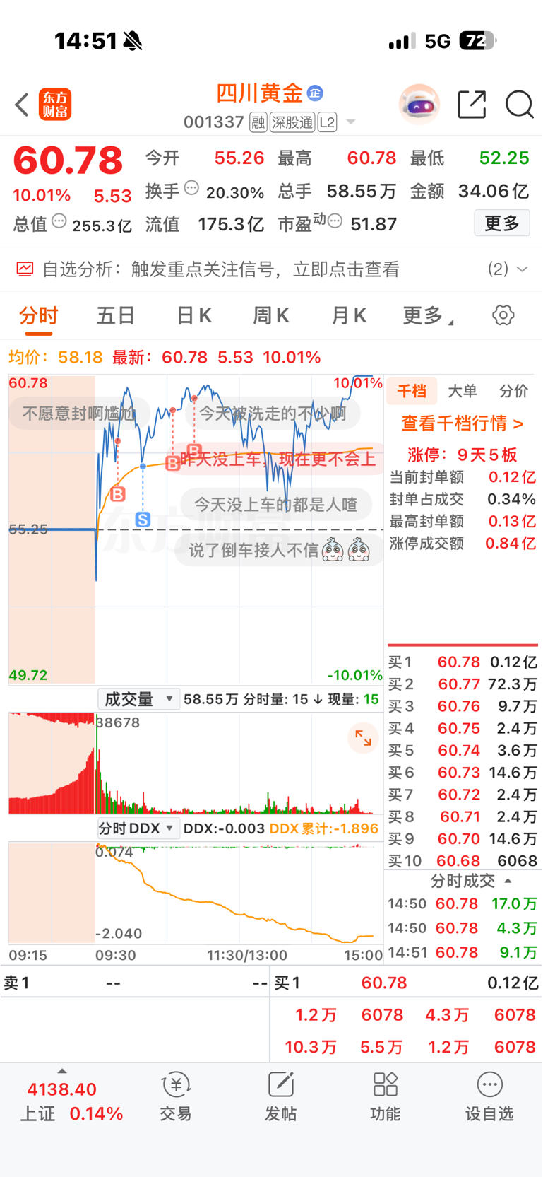 $四川黄金(SZ001337)$ 黄金股票跟随国际期货金价走的,市场好坏看期货价格就行了,gjd 干预有限,另外还有大哥湖金八十多亿一字涨停封单在顶着, 炒股带脑子,那些卖飞的人,我劝你自己的钱不要掌握在别人嘴巴里面,目前资金全仓梭哈了,反 T 是因为触发条件单自动卖出了