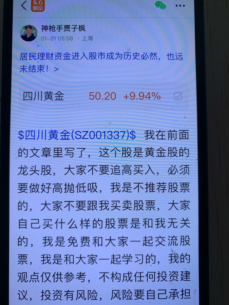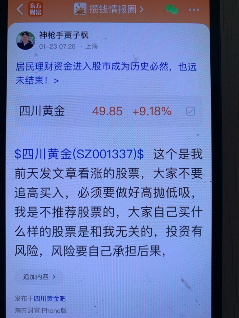 $四川黄金(SZ001337)$ 这个股我是一个月十六号发表看涨的文章,大家不要追高买入,必须要做好高抛低吸,我是不推荐股票的,大家不要跟我买卖股票,大家自己买什么样的股票是和我无关的,因为我是免费和大家一起交流股票,我是和大家一起学习的,我的观点仅供参考,不构成任何投资建议,投资有风险,风险要自己承担后果,