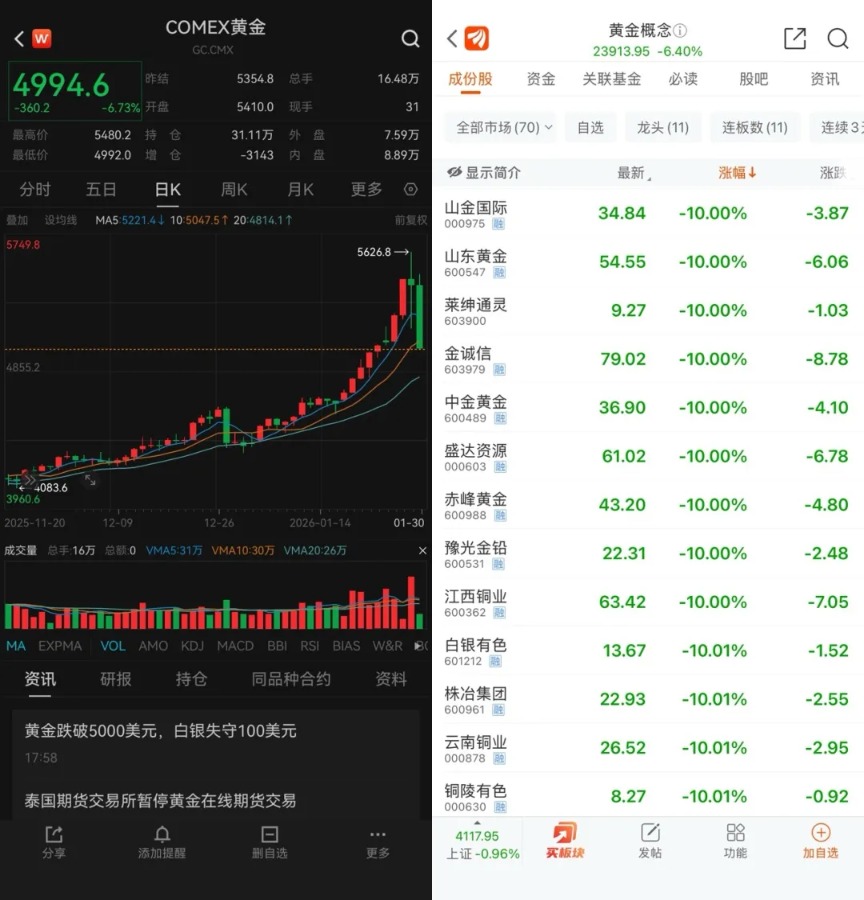 蓝鲸新闻1月30日讯 现货黄金价格在过去两三天内经历了“过山车”般的行情。30日,国际金价大幅回调,失守5000美元/盎司,而前一日其最高飚至5600美元/盎司。同日,A股黄金概念板块掀起“跌停潮”,四川黄金、山东黄金、 中金黄金等大面积跌停。