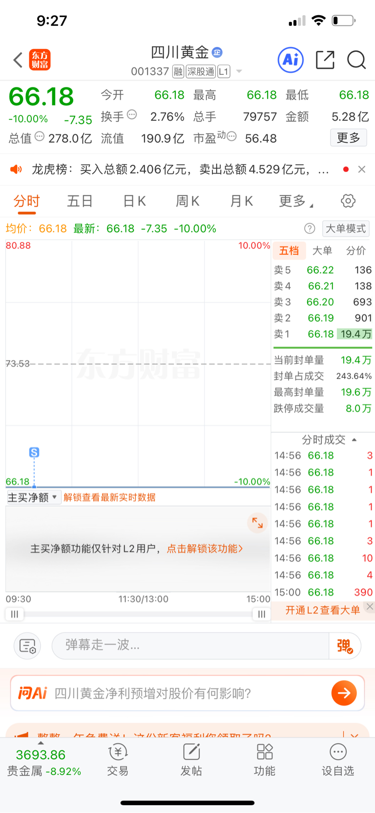 $四川黄金(SZ001337)$ 今天早上开盘挂了,20分钟就卖出去了