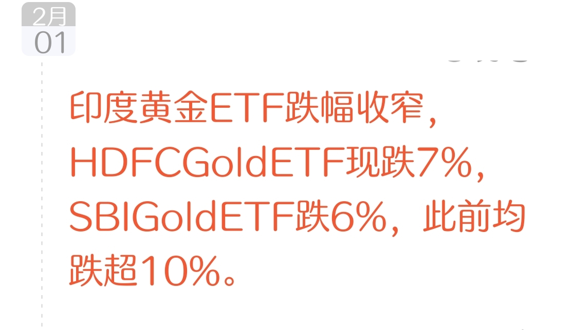 2月1日,印度为配合新财年预算案首次于周日开市。受政策预期影响,HDFC Gold ETF、SBI Gold ETF一度跌超10%,随后跌幅收窄,分别下跌7%和6%,市场恐慌情绪有所缓解。