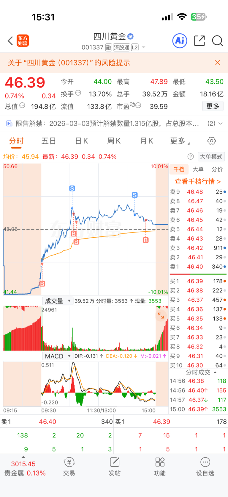 $四川黄金(SZ001337)$ 来了来了 周一要高开了 开盘48元高开高走