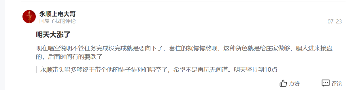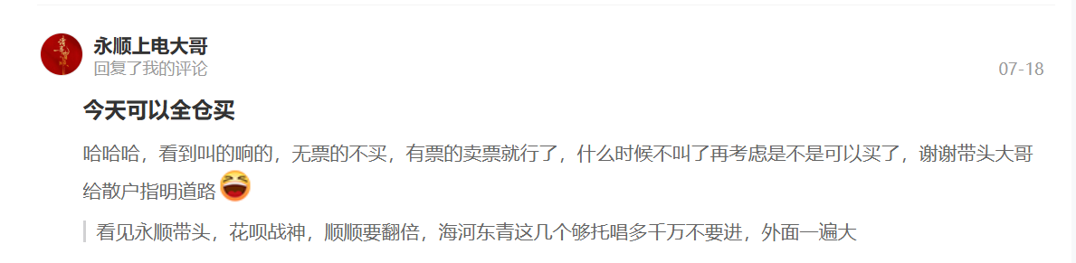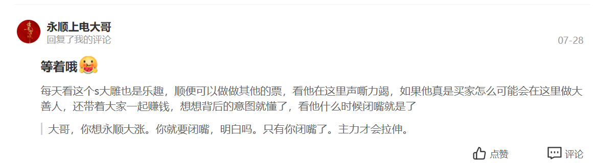 温馨提示: 1.根据《证券法》规定,禁止编造、传播虚假信息或者误导性信息,扰乱证券市场;2.用户在本社区发表的所有资料、言论等仅代表个人观点,与本网站立场无关,不对您构成任何投资建议。用户应基于自己的独立判断,自行决定证券投资并承担相应风险。《东方财富社区管理规定》