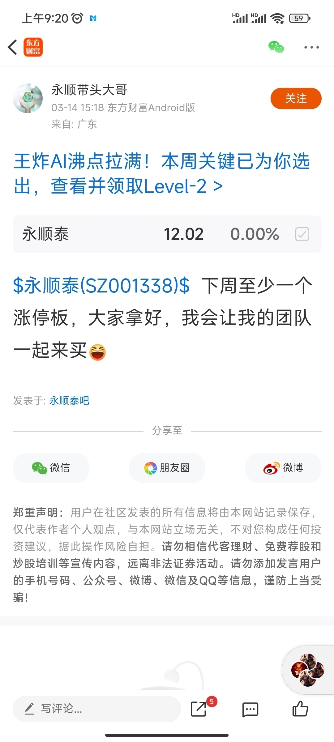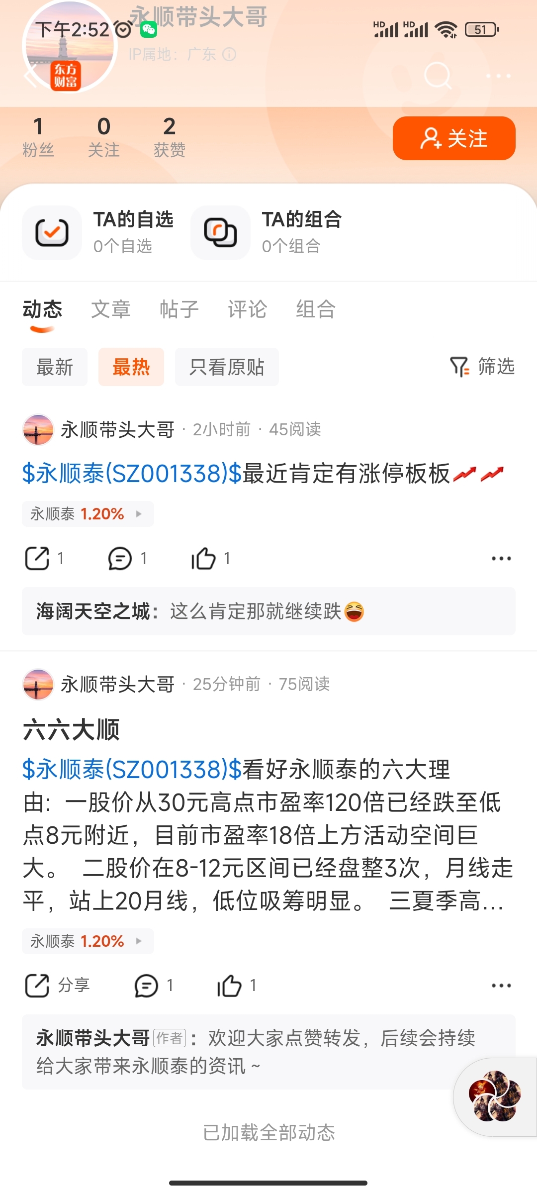 $永顺泰(SZ001338)$ 大家注意这里有一只苟12元高位的时候使劲唱多忽悠人接盘,我揭穿它,它就经常换马甲来继续唱多忽悠人接盘,最近很多唱多的托忽悠人接盘,新进的韭菜注意安全了,永不顺年年都是12元是大顶