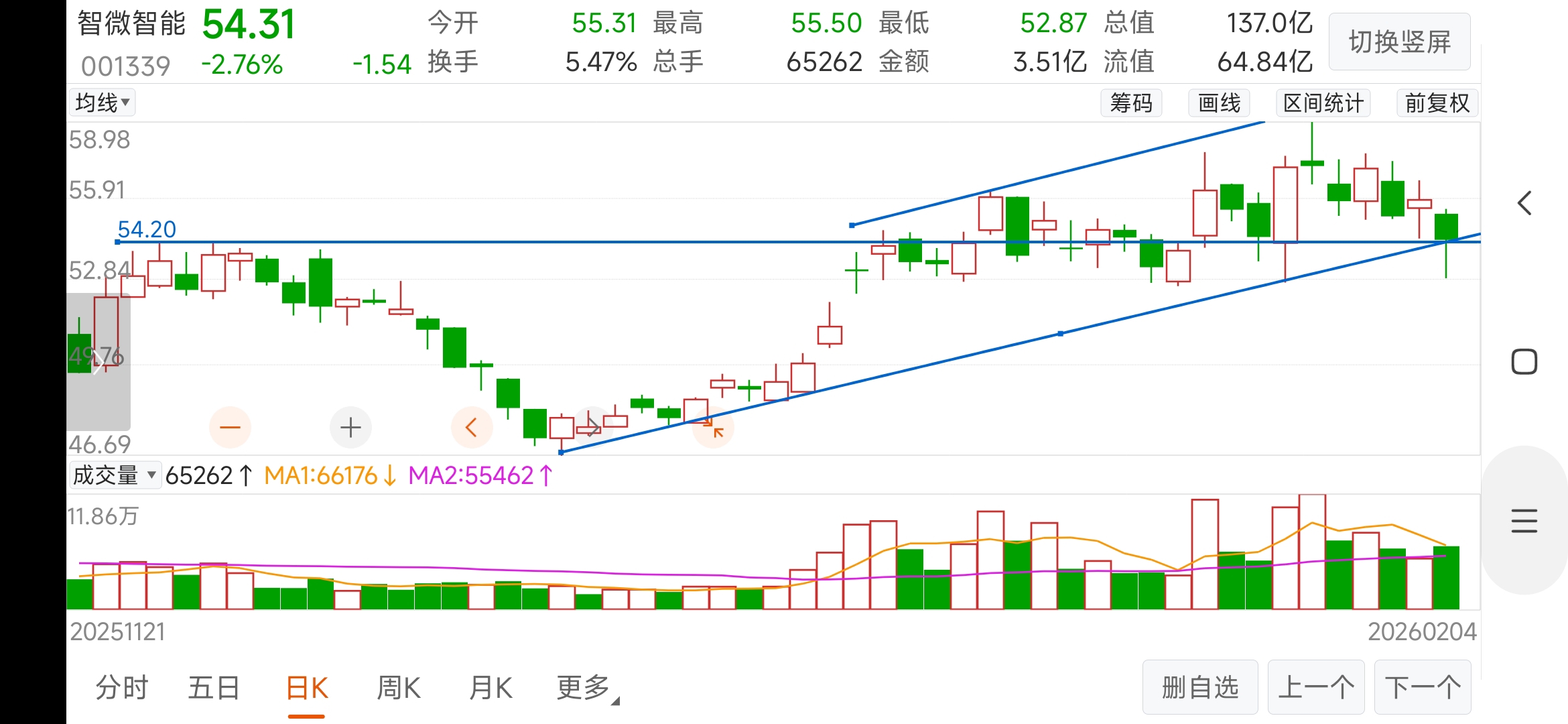 $智微智能(SZ001339)$ 盘中跌破双线时,曾考虑出局,但不甘心,想捱到收盘再说,或许主力狡猾诱空。毕竟题材太好,不想琵琶别抱。果然,收盘站上颈线并支撑线,危城暂时无虞。明日如是阳线,则下跌终止,智微再拾升势。