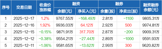 富岭股份:融资净偿还168.49万元,融资余额9767.55万元(12-17)