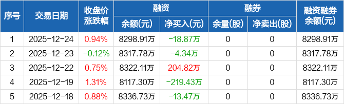 兴欣新材:融资净偿还18.87万元,融资余额8298.91万元(12-24)
