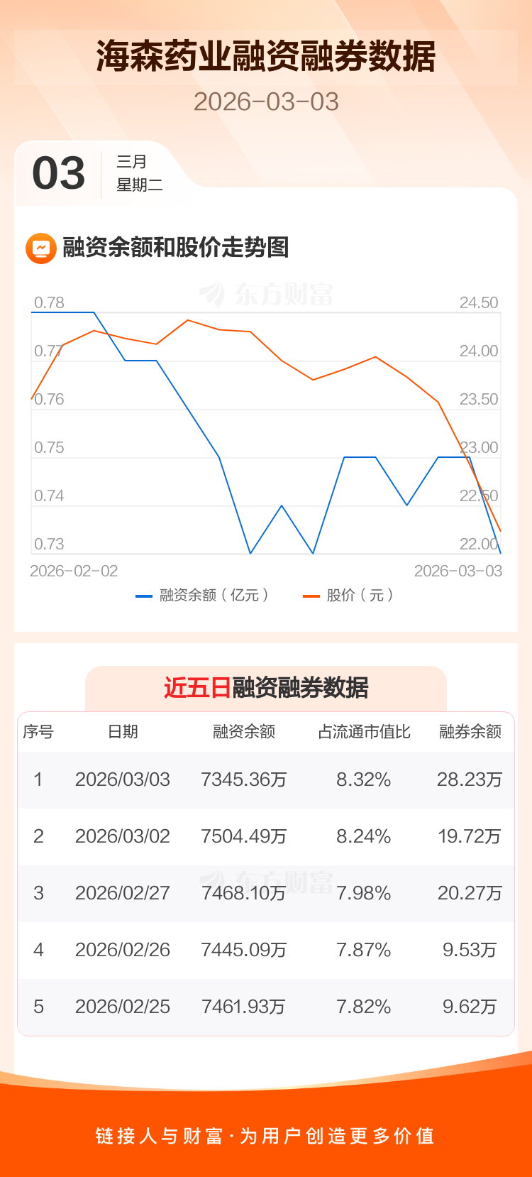 交易所最新数据显示,海森药业于2026年3月3日获融资买入450.74万元,融资偿还609.86万元,当日融资净偿还159.12万元。目前,该股融资余额7345.36万,占流通市值比例为8.32%。
