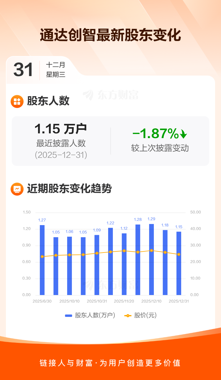 通达创智最新披露数据显示,截至12月31日公司股东户数为1.15万户,较上期(2025年12月19日)减少220户,降幅为1.87%。户均持有流通股数量由上期的2729股上升至2781股,户均持股金额由上期的7.05万元减少至6.84万元。