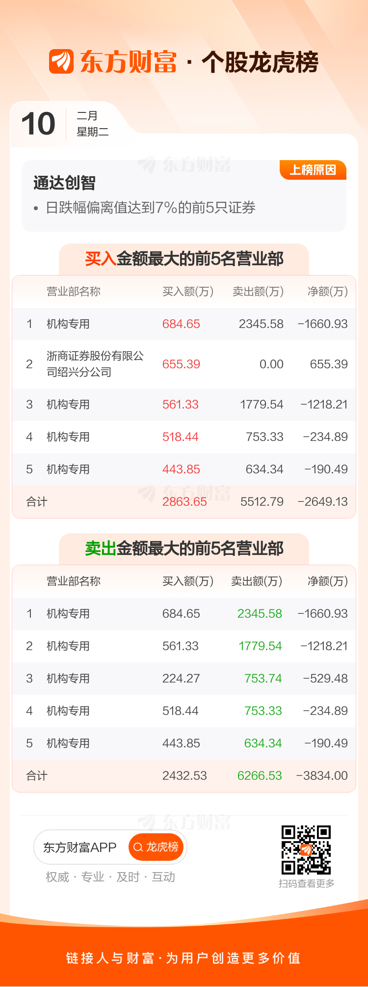 交易所2026年2月10日公布的交易公开信息显示,通达创智因成为日跌幅偏离值达到7%的前5只证券上榜。通达创智当日收报28.2元,涨跌幅-9.99%,偏离值-10.05%,换手率24.14%,成交额2.26亿。