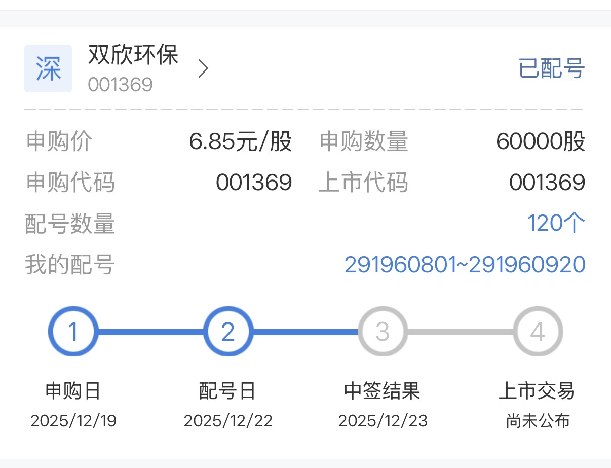$双欣环保(SZ001369)$ 大哥,年前能不能让我中一签啊!你可是给我配了120个号呢!