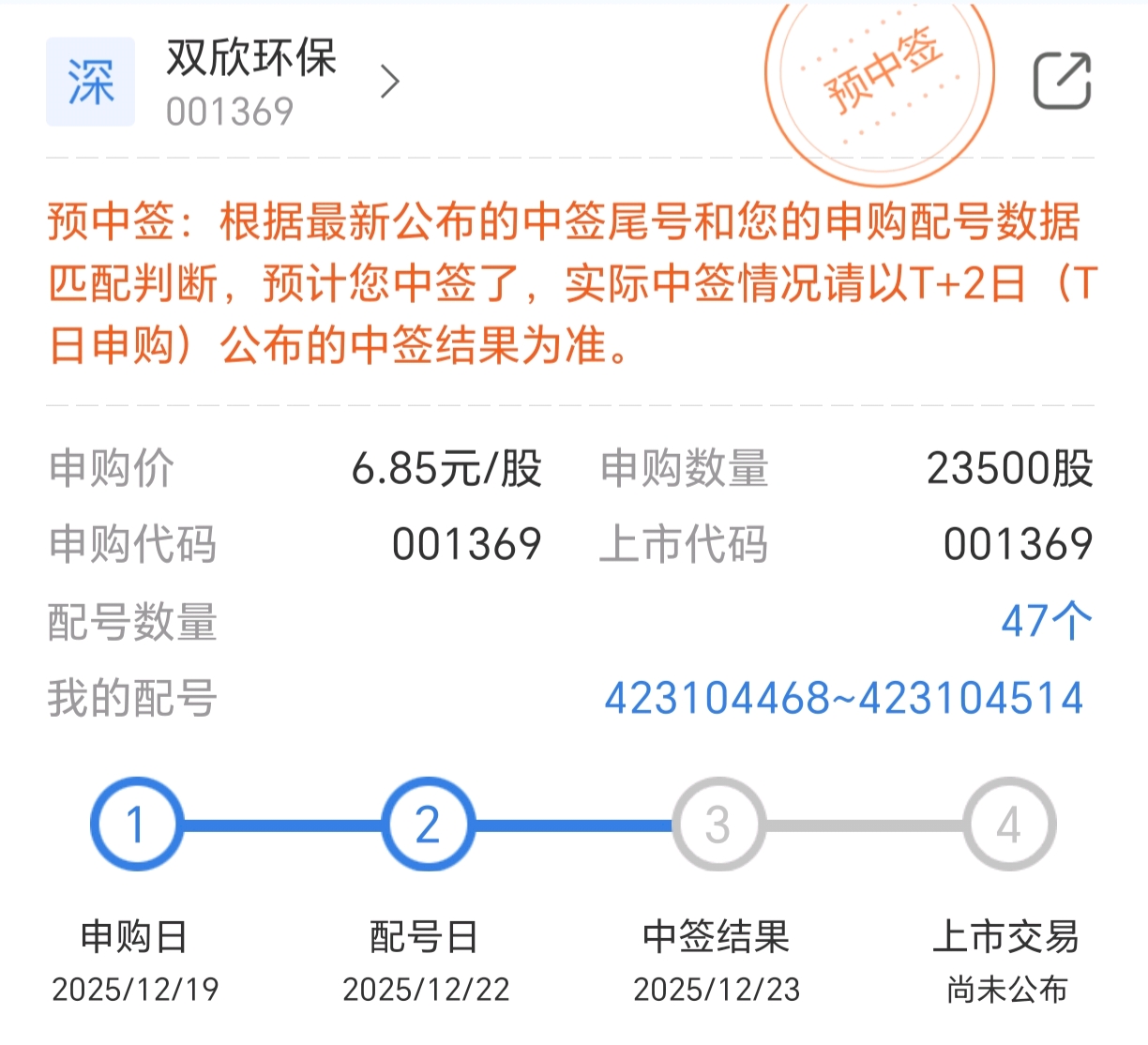 $双欣环保(SZ001369)$ 炒这么久,交了这么多学费,第一次中签,蚊子肉也是肉啊,挣瓶茅子应该不是问题吧