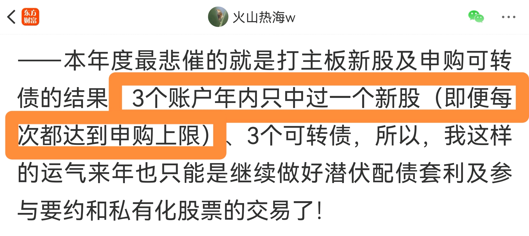 ——本年度最悲催的就是打主板新股及申购可转债的结果:3个账户年内只中过一个新股(即便每次都达到申购上限)、3个可转债,所以,我这样的运气来年也只能是继续做好潜伏配债套利及参与要约和私有化股票的交易了!