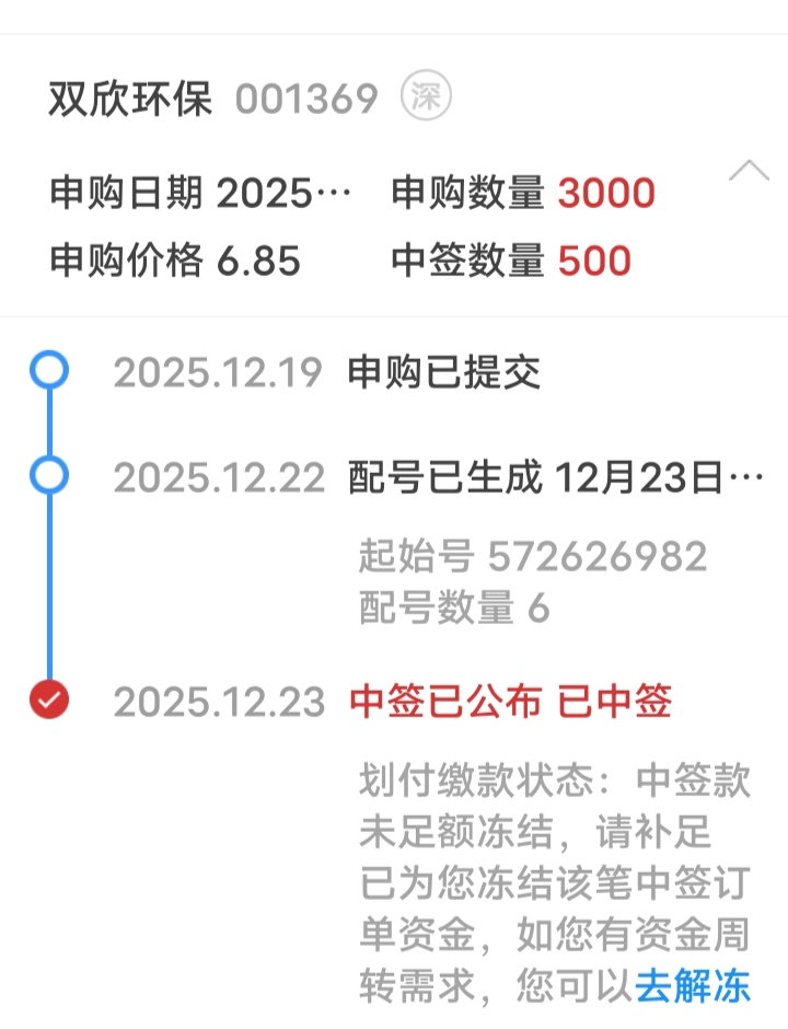 $双欣环保(SZ001369)$ 6个配号也中了。