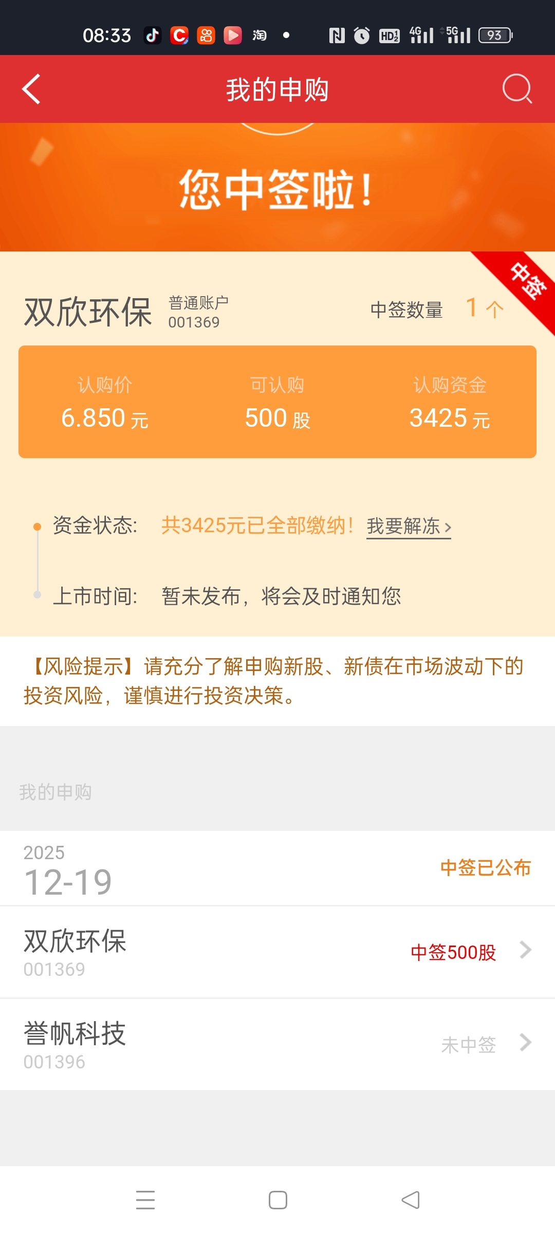 $双欣环保(SZ001369)$ 打了一年的新,终于中了一次,可惜才500股,白激动了一下
