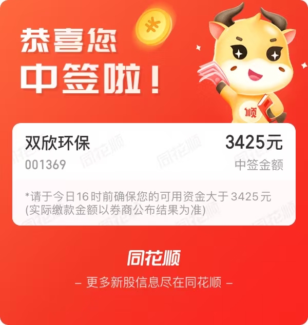 $双欣环保(SZ001369)$ 我也是第一次中新股