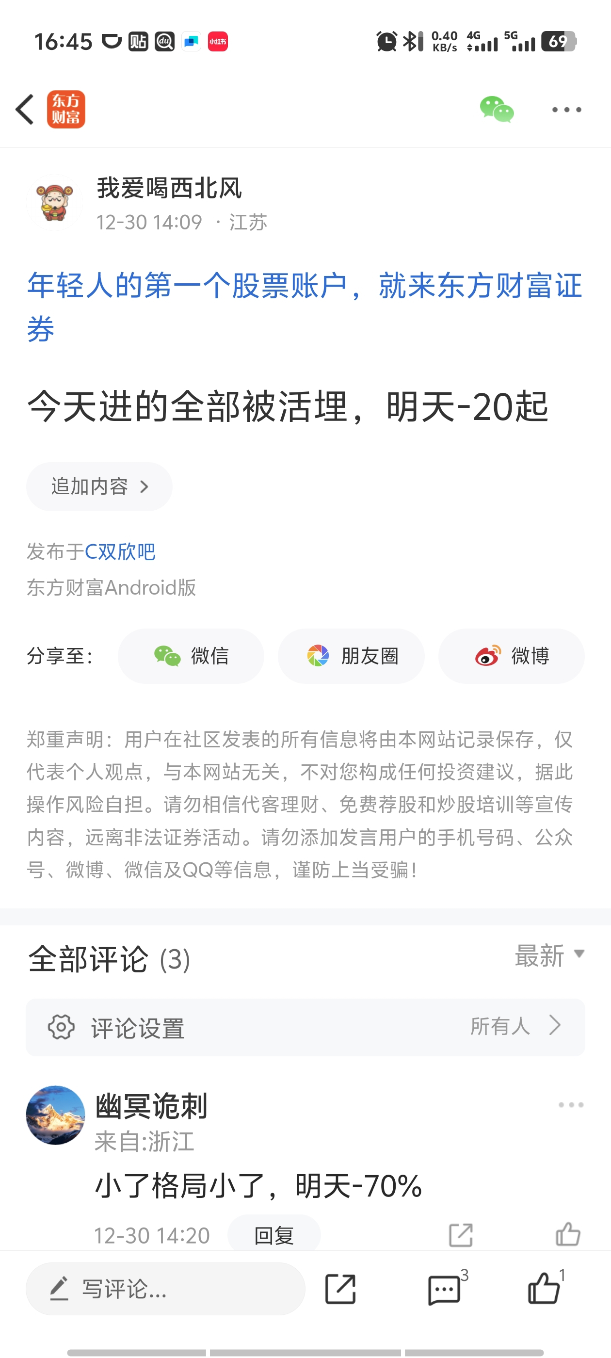 温馨提示: 1.根据《证券法》规定,禁止编造、传播虚假信息或者误导性信息,扰乱证券市场;2.用户在本社区发表的所有资料、言论等仅代表个人观点,与本网站立场无关,不对您构成任何投资建议。用户应基于自己的独立判断,自行决定证券投资并承担相应风险。《东方财富社区管理规定》