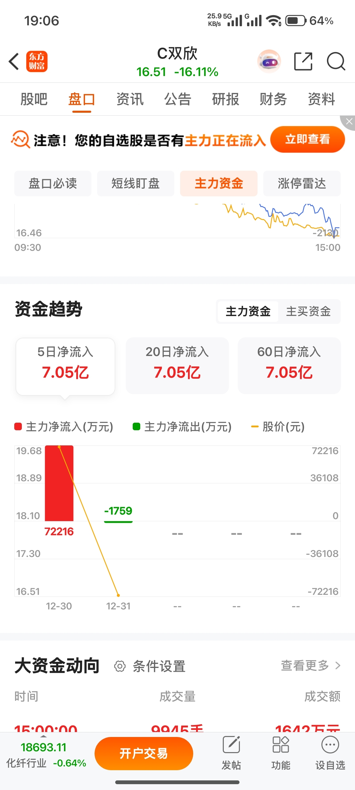 $C双欣(SZ001369)$ 昨天买入那么多,今天只出这么点,就跌这么多吗
