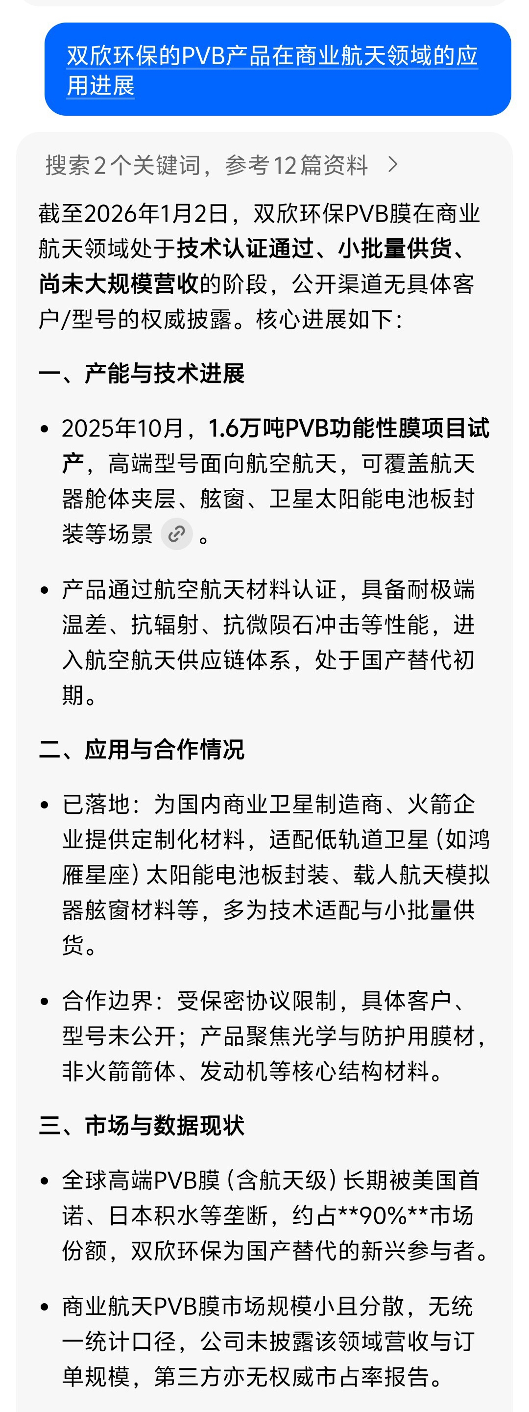 全球高端PVB膜,含航天级别的,被美,日,垄断,而双欣环保的产品可以突破壁垒,实