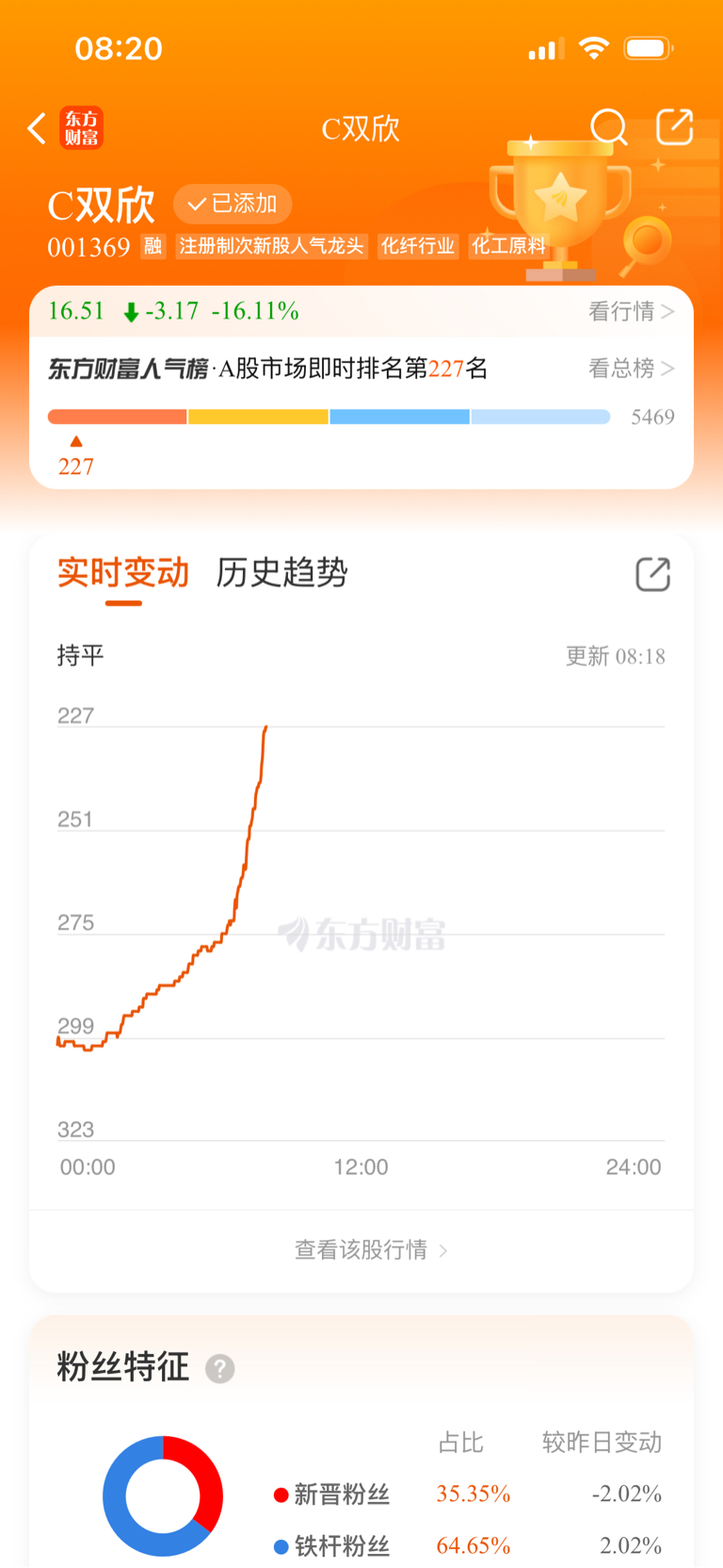 $C双欣(SZ001369)$ 今天要是高开的话人气估计前50