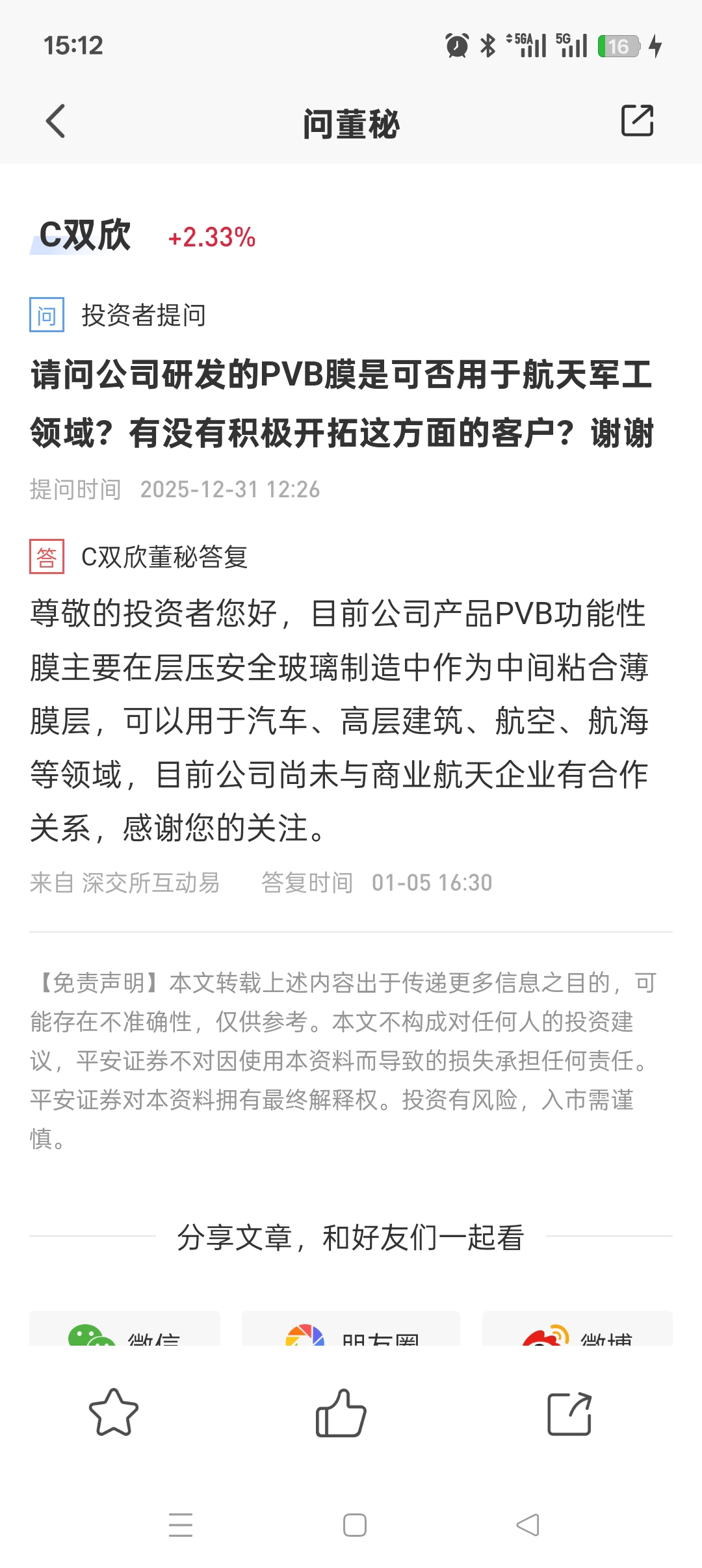 $C双欣(SZ001369)$