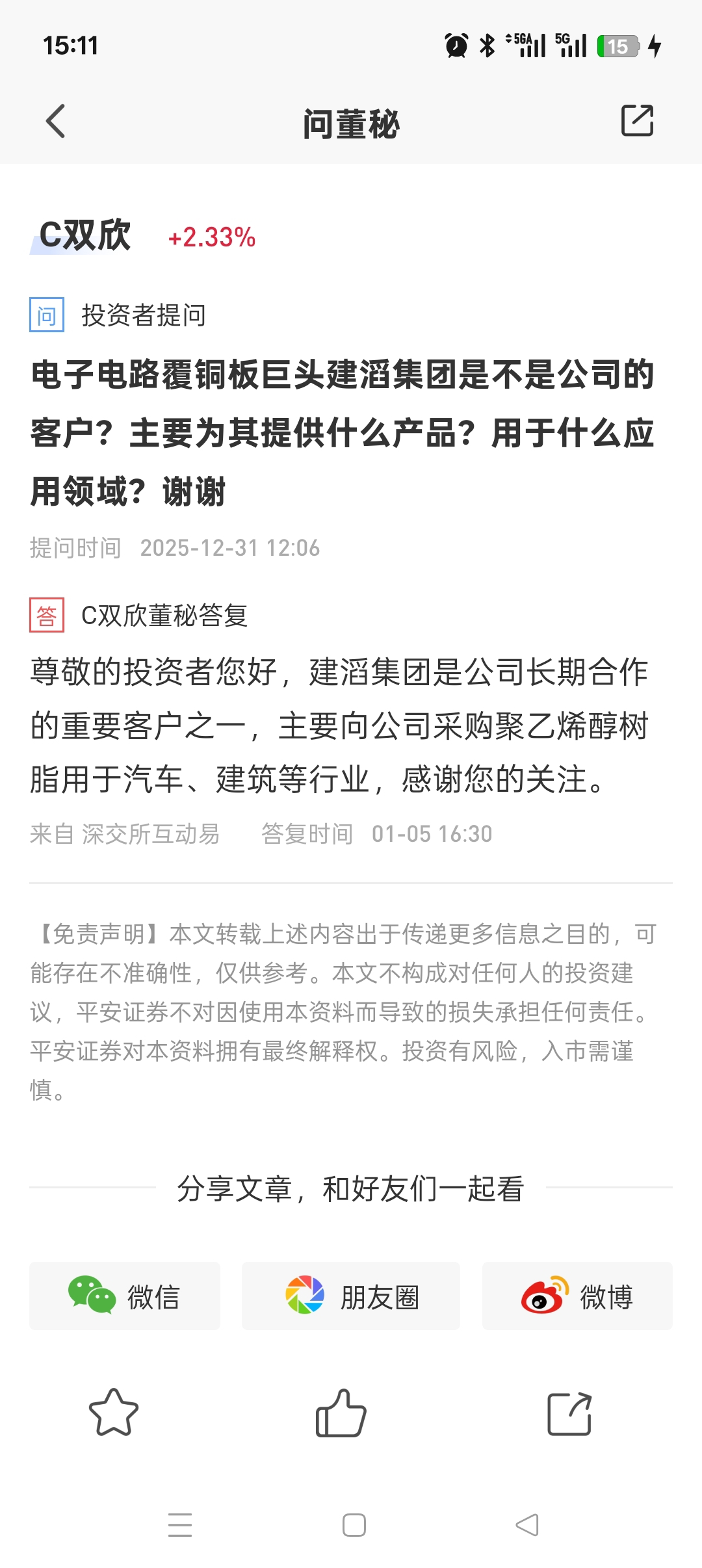 $C双欣(SZ001369)$