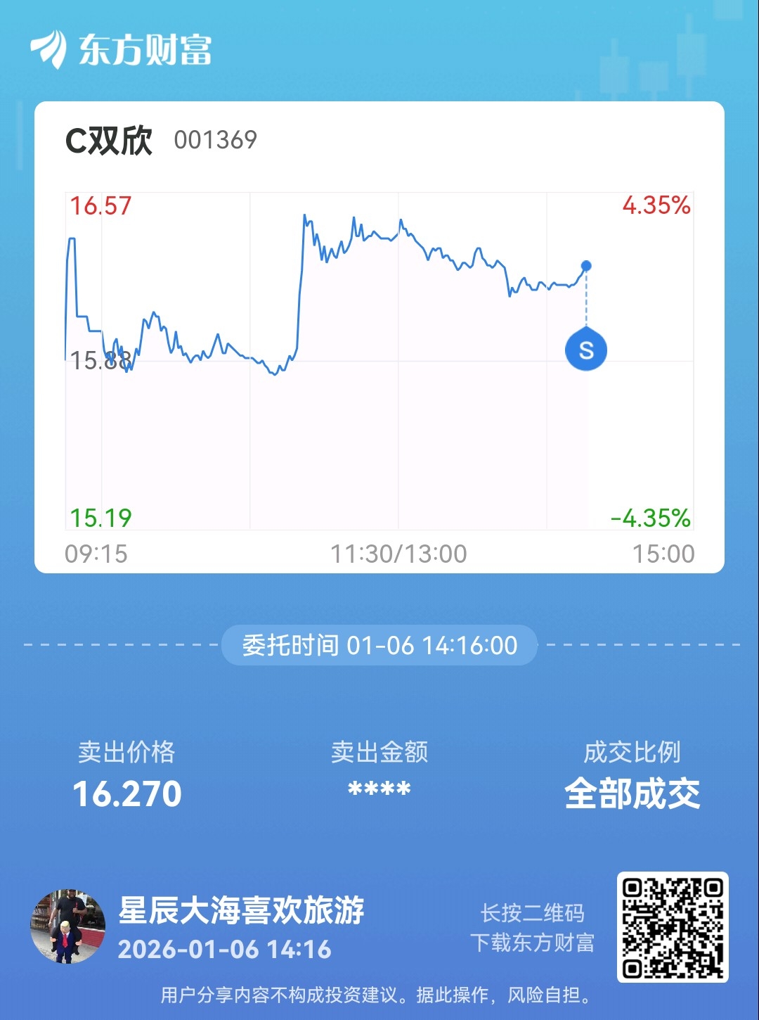 $C双欣(SZ001369)$ 明天上涨的可能性不大,C5最后一天应该还会极限打压出货,今天尾盘卖了的是对的,盘子太大没啥炒作空间,昨天尾盘入,今天下午跑了,除了中签的应该没几个像我一样挣钱离开的吧!