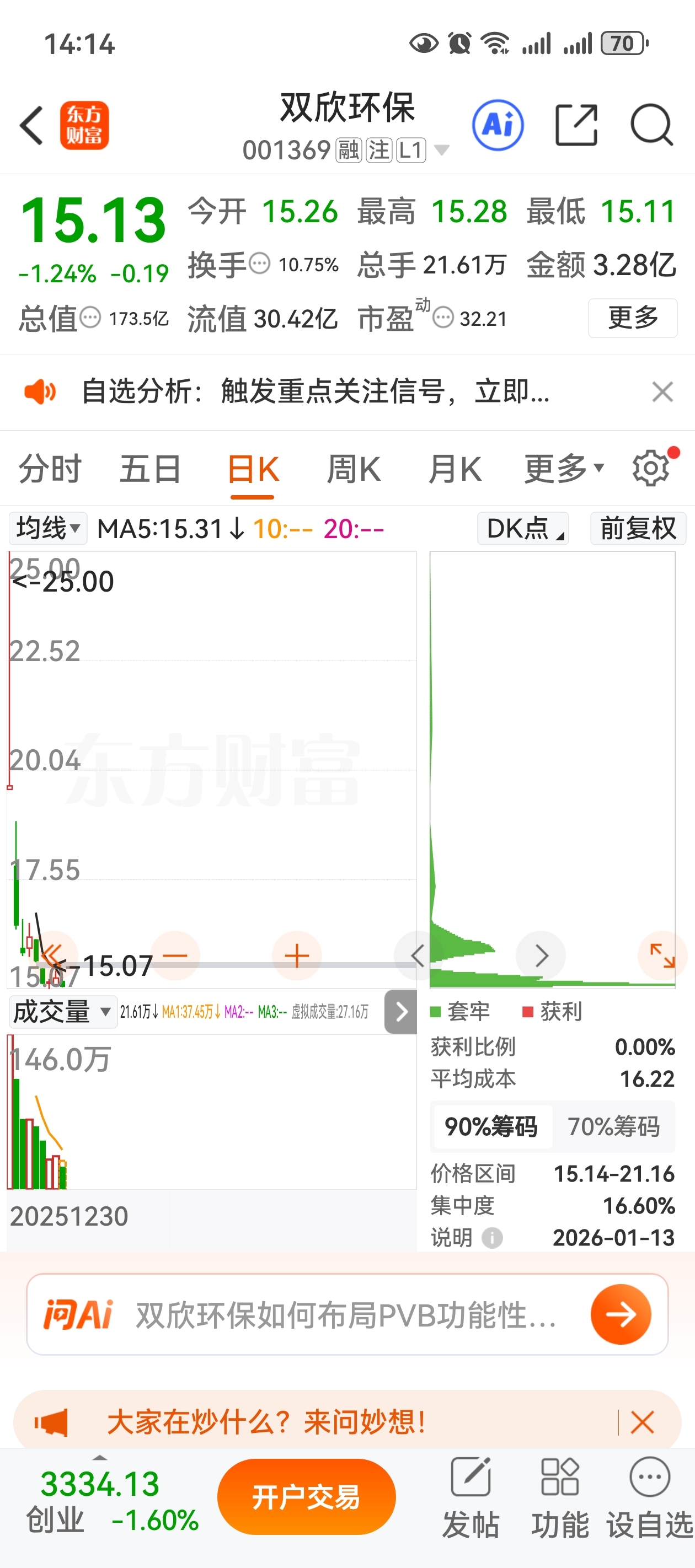 $双欣环保(SZ001369)$ 几乎天天跌。在15块这里磨叽几天了。我一生气把你割了,换股。