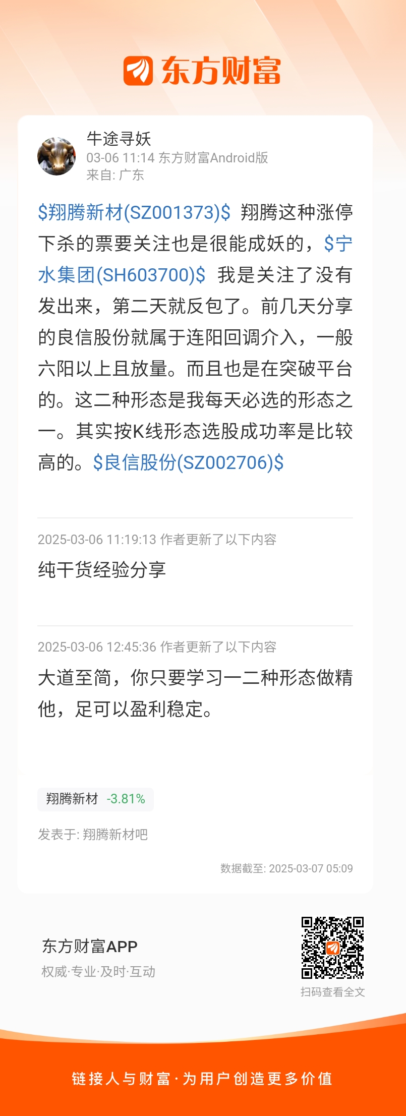 $翔腾新材(SZ001373)$ 翔腾这种涨停下杀的票要关注也是很能成妖的,$宁水集团(SH603700)$ 我是关注了没有发出来,第二天就反包了。前几天分享的良信股份就属于连阳回调介入,一般六阳以上且放量。而且也是在突破平台的。这二种形态是我每天必选的形态之一。其实按K线形态选股成功率是比较高的。$良信股份(SZ002706)$