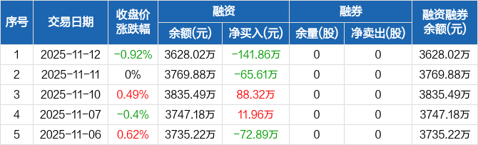 翔腾新材:融资净偿还141.86万元,融资余额3628.02万元(11-12)
