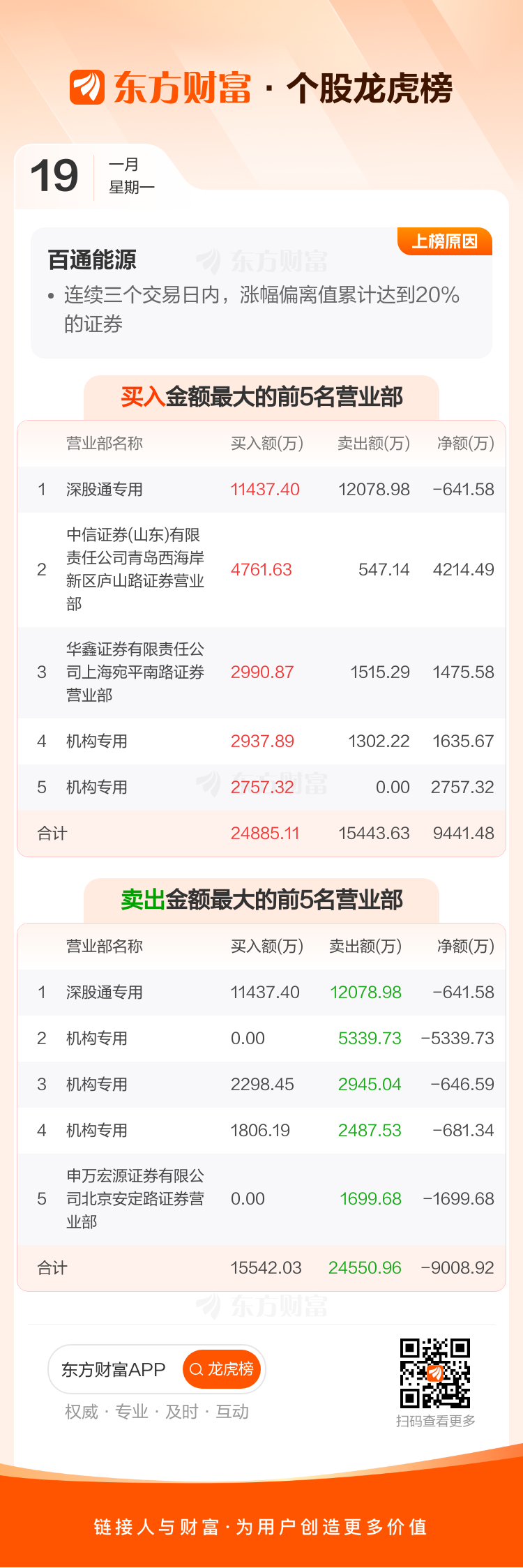 交易所2026年1月19日公布的交易公开信息显示,百通能源因成为连续三个交易日内,涨幅偏离值累计达到20%的证券上榜。百通能源当日收报19.76元,涨跌幅10.02%,换手率11.73%,成交额4.78亿。异常期间1月15日至1月19日,期间涨幅22.81%,累计偏离值22.56%,区间成交额14.46亿。