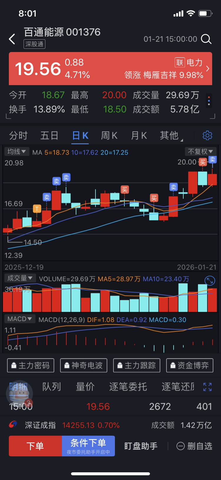 $百通能源(SZ001376)$ 昨天19.76元压力位减掉前天加仓的筹码,降低一下持仓成本。