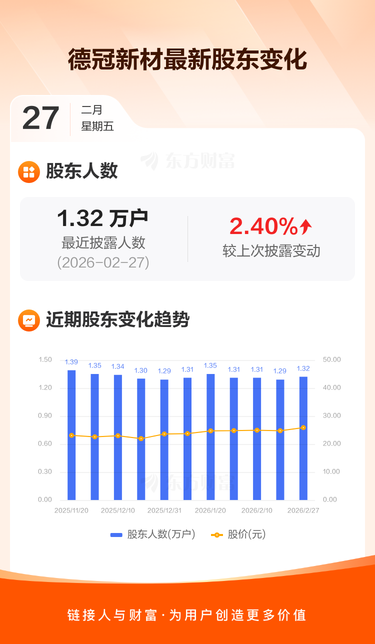 德冠新材:截至2月27日最新股东户数1.32万户,较上期增加2.40%