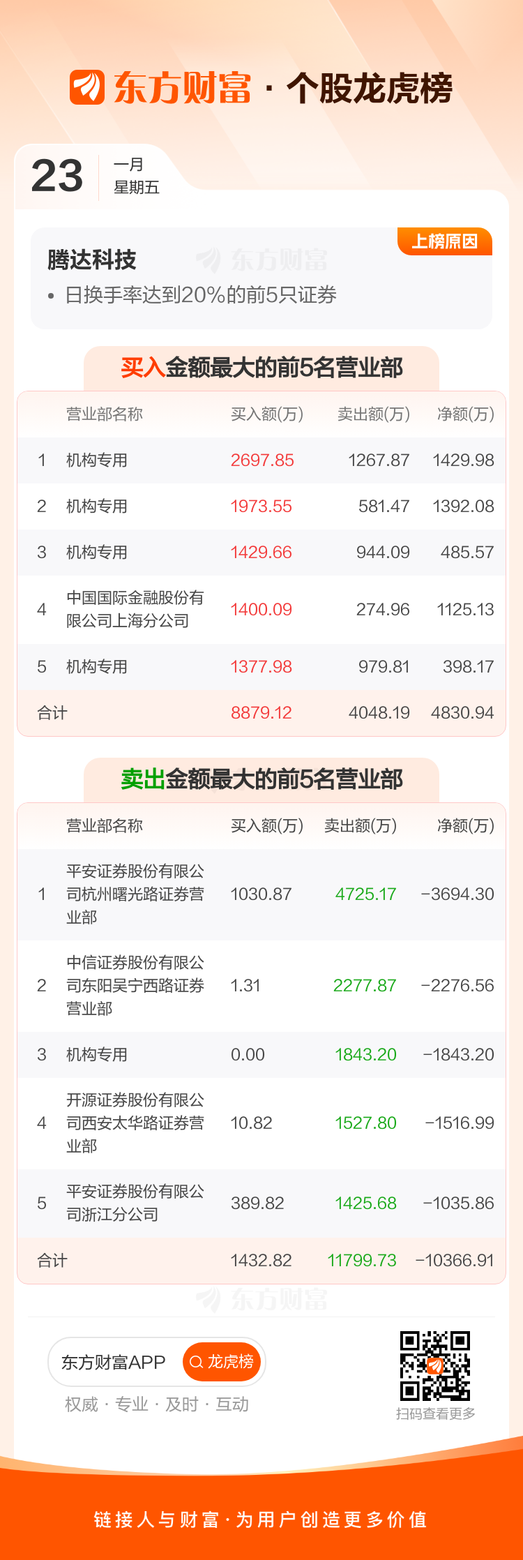 交易所2026年1月23日公布的交易公开信息显示,腾达科技因成为日换手率达到20%的前5只证券上榜。腾达科技当日收报25.5元,涨跌幅-0.39%,偏离值44.96%,换手率44.96%,成交额7.78亿。