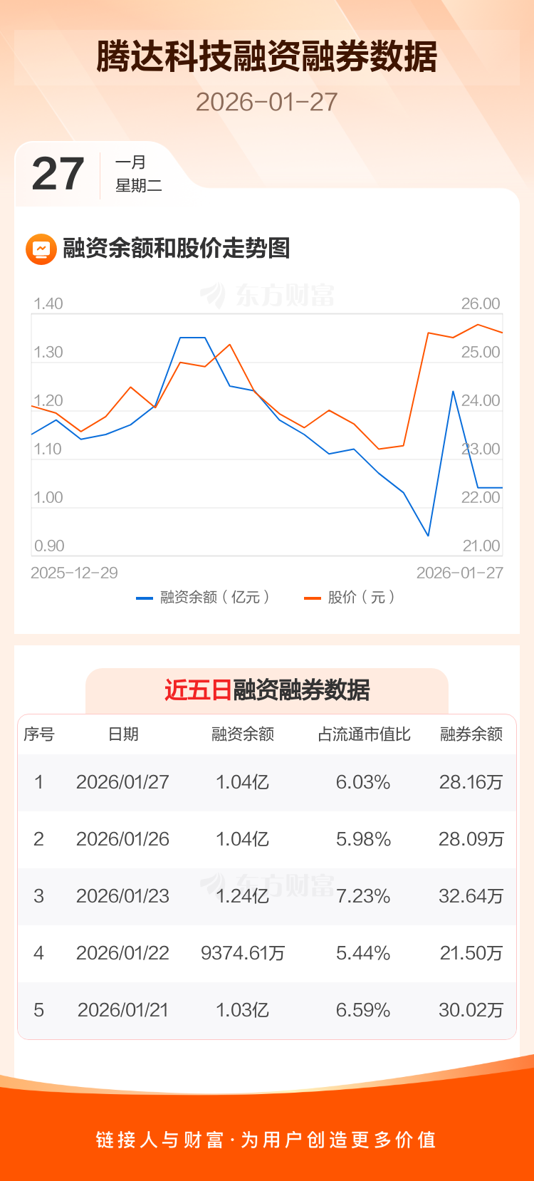 交易所最新数据显示,腾达科技于2026年1月27日获融资买入2091.11万元,融资偿还2061.77万元,当日融资净买入29.33万元。目前,该股融资余额1.04亿,占流通市值比例为6.03%。