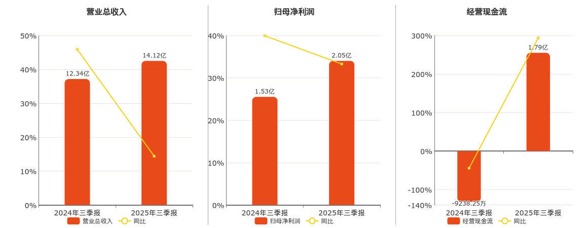 公司营业总收入为14.12亿元。归母净利润为2.05亿元。经营活动现金净流入为1.79亿元。
