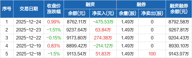 新亚电缆:融资净偿还475.53万元,融资余额8762.11万元(12-24)