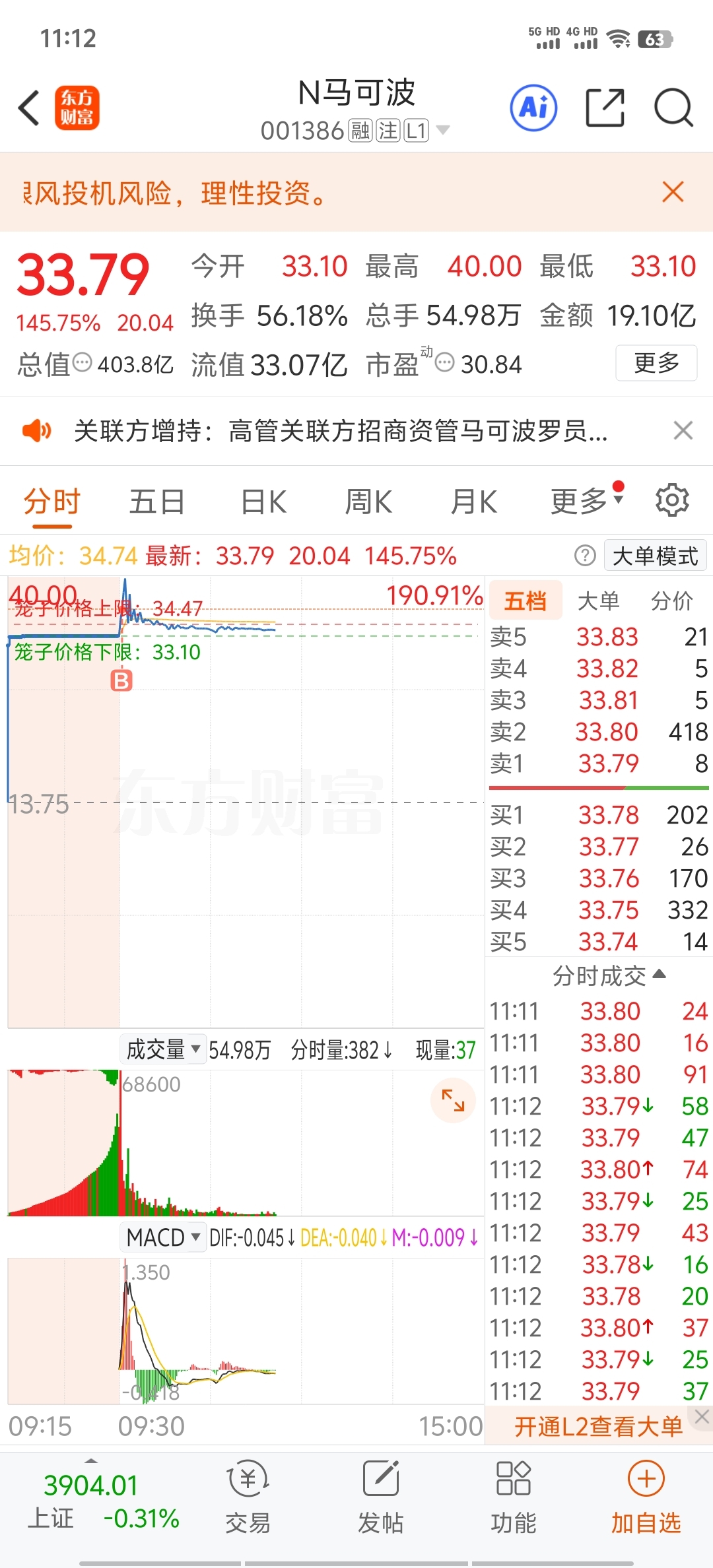 $N马可波(SZ001386)$ 复盘,买入,认亏,不管盈亏明天尽早离场,以后不再碰新股,不碰超过自己认知的东西。原因一是软件推送这个股在大盘最前列,二是新股上市不懂玩法,三是对这个瓷砖品牌熟悉,情绪上头就跟风。