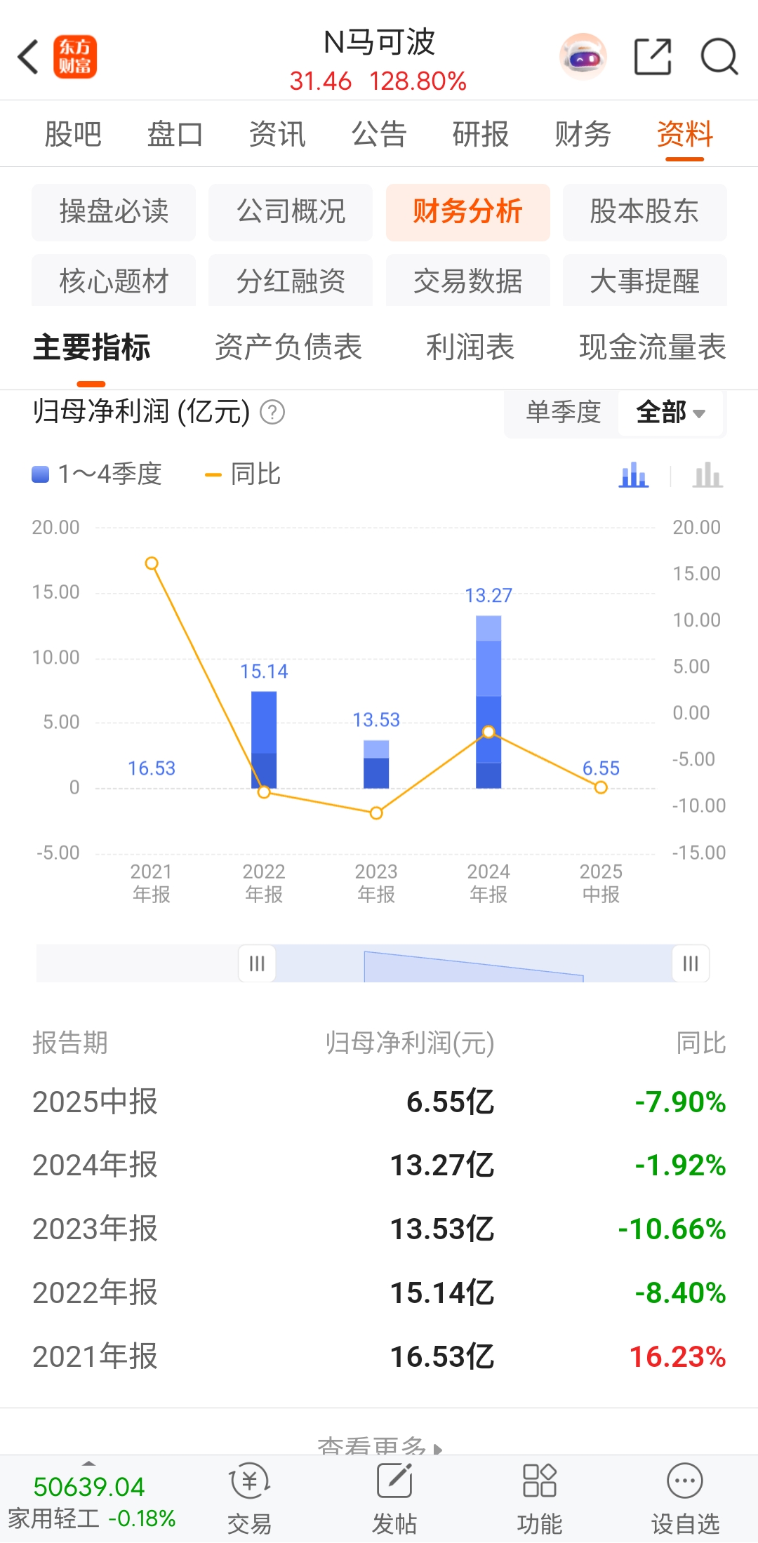 $N马可波(SZ001386)$ 人性就是这样的,炒亏损股大涨,股吧里一片骂,说炒业烂的市赢率几千倍的。马可波罗,每年净利润13亿,它们也要骂,说什么夕阳产业,你家夕阳产业每年能赚13亿啊,买你的科技亏损股,每年搞13亿吗