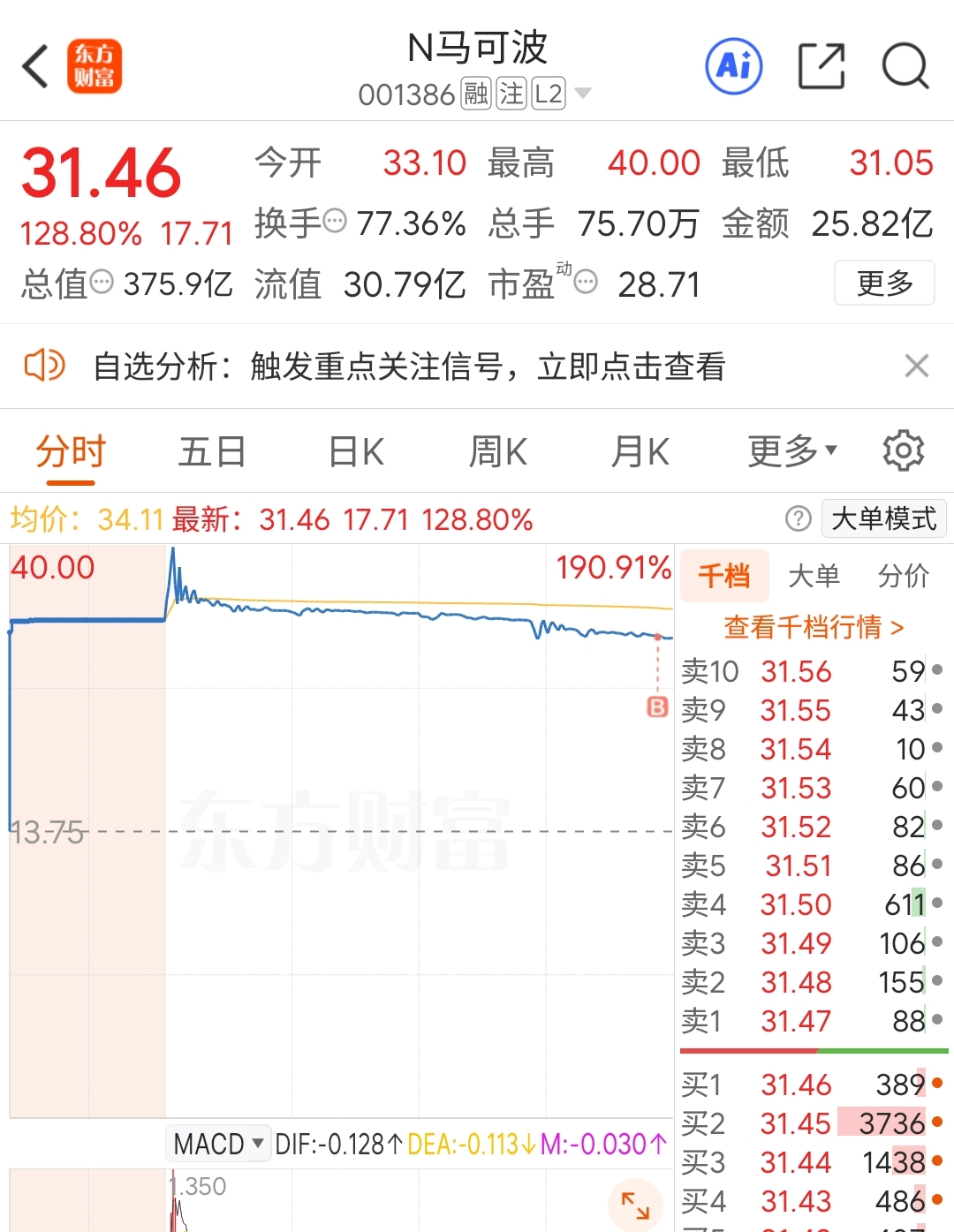 $N马可波(SZ001386)$ 搞了点马可波罗,难道只有我一个人看到脉冲到60吗,明天竞价弱转强就搞点刺激的