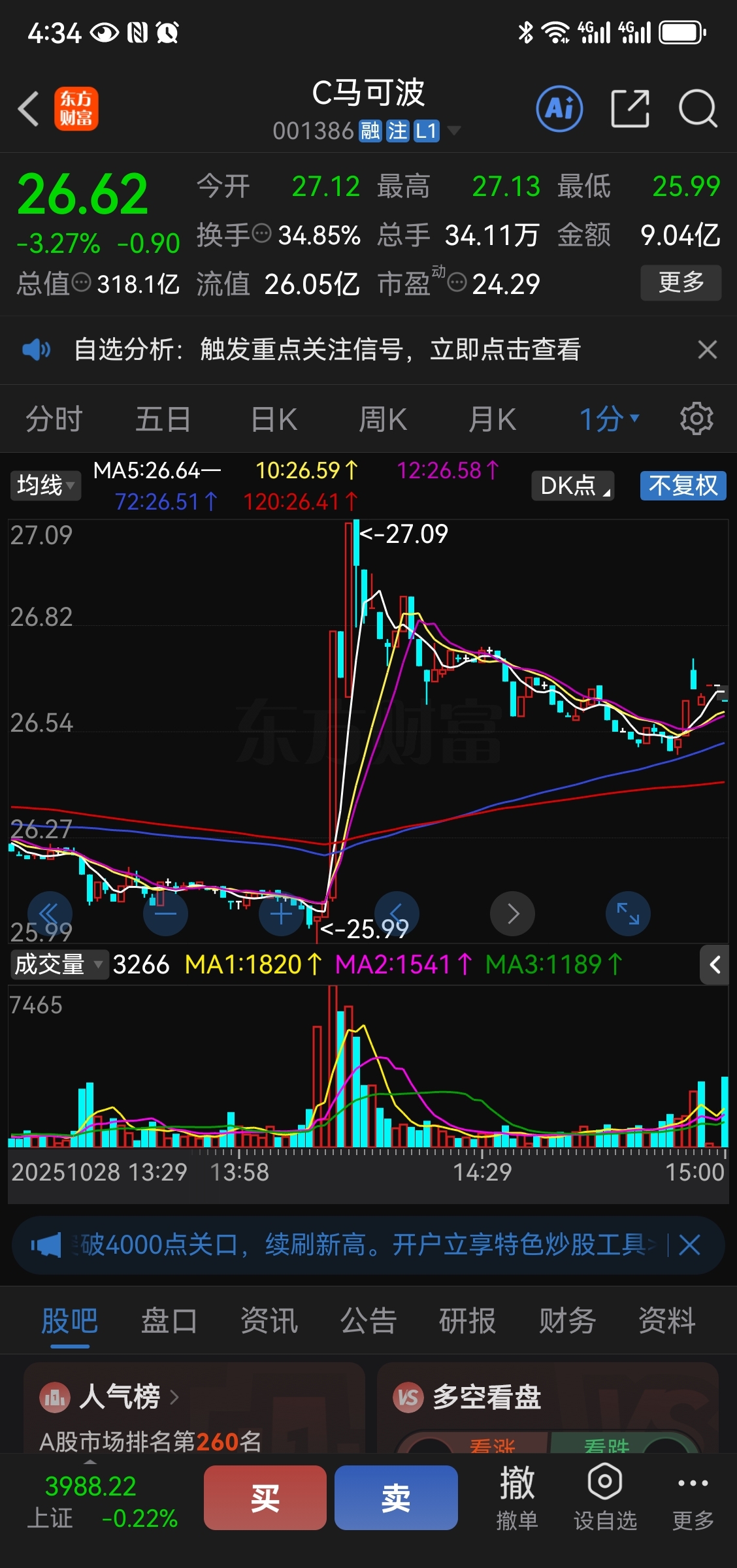 $C马可波(SZ001386)$ 探底成功了,为何还在唱空呢