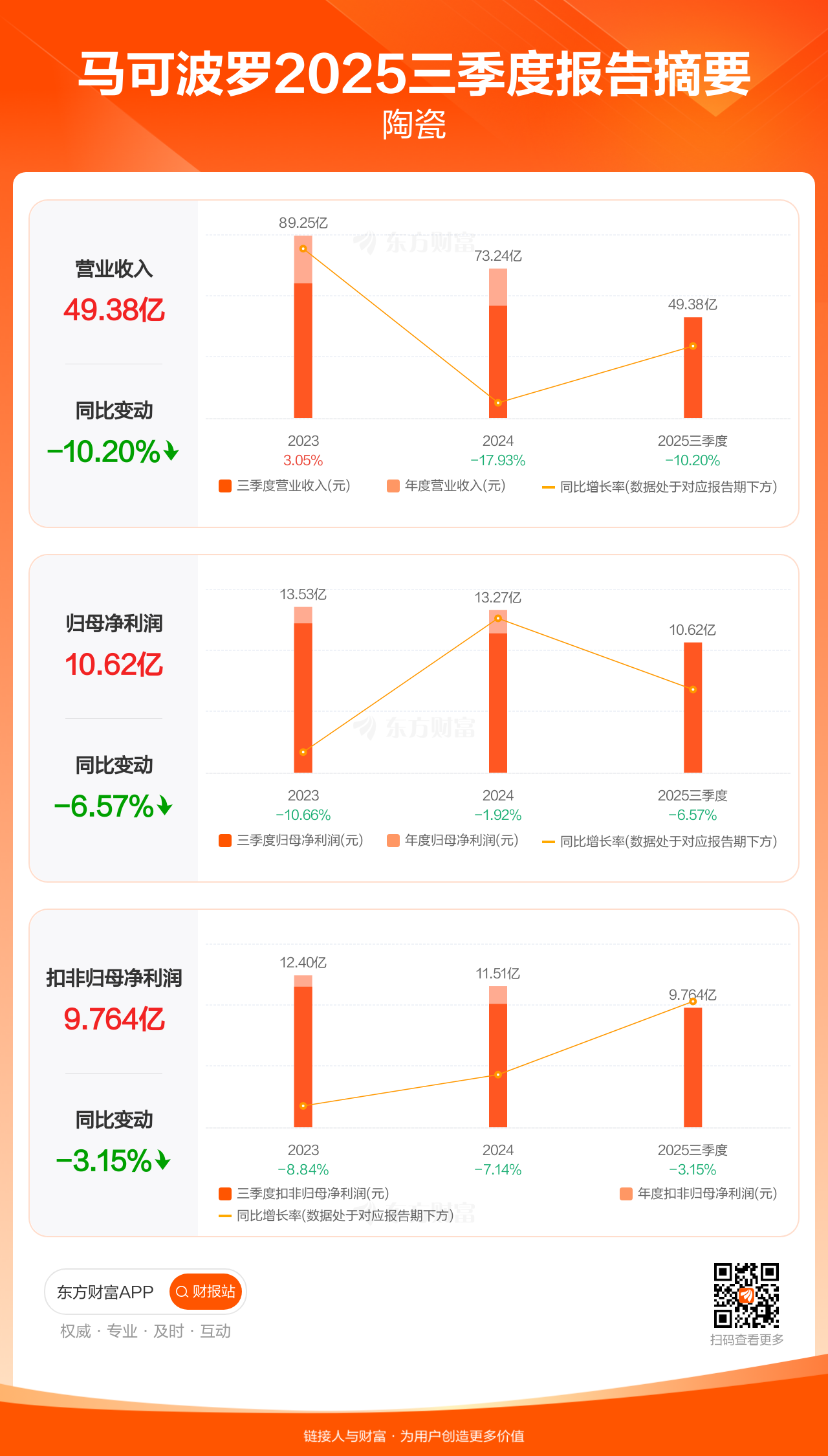 马可波罗10月30日发布2025年三季报显示,公司前三季实现营业收入49.38亿元,同比下滑10.20%;归母净利润10.62亿元,同比下滑6.57%;扣非归母净利润9.76亿元,同比下滑3.15%。