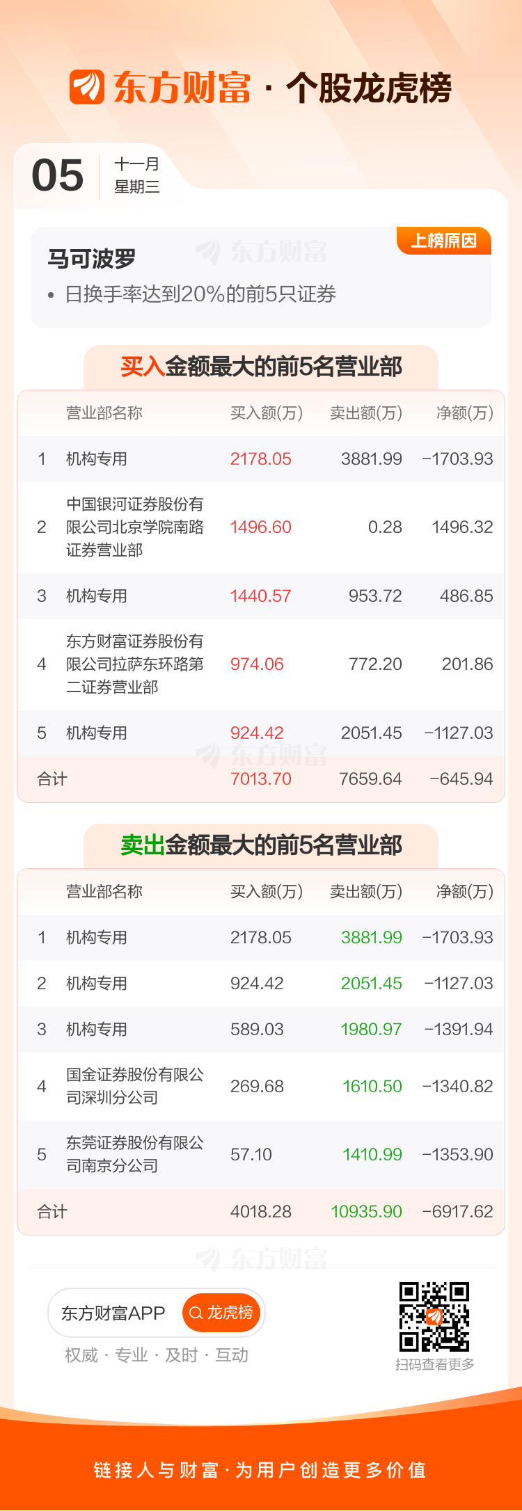 交易所2025年11月5日公布的交易公开信息显示,马可波罗因成为日换手率达到20%的前5只证券上榜。马可波罗当日收报27.58元,涨跌幅-0.43%,偏离值35.22%,换手率35.22%,成交额9.61亿。