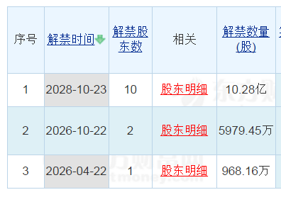 解禁分三批,2026年4月解禁968万,2026年10月解禁5979万,2028年10月解禁10.28亿。