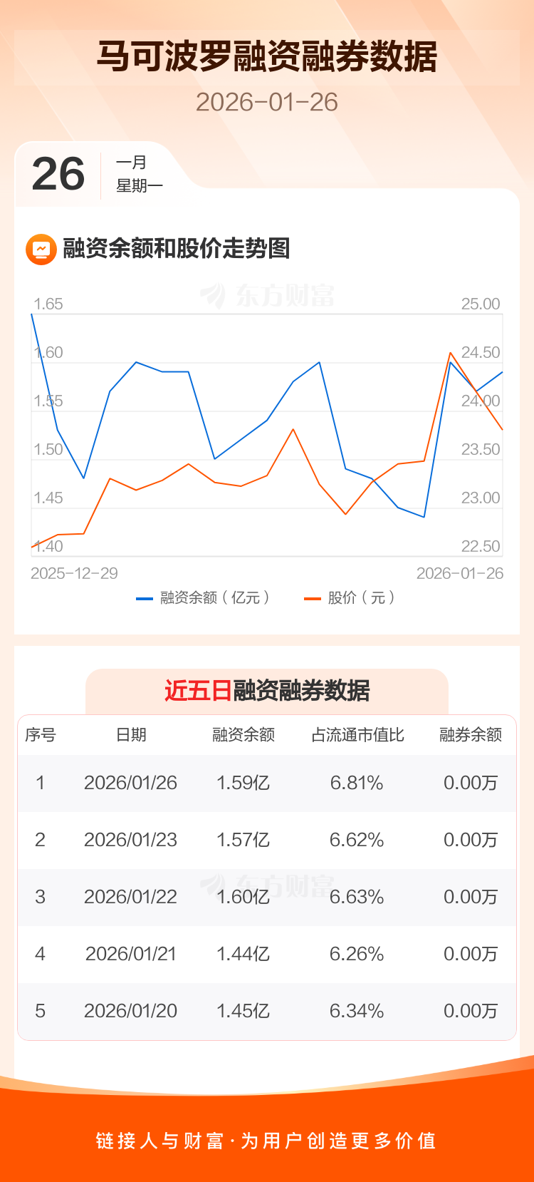交易所最新数据显示,马可波罗于2026年1月26日获融资买入1755.73万元,融资偿还1579.75万元,当日融资净买入175.98万元。目前,该股融资余额1.59亿,占流通市值比例为6.81%。