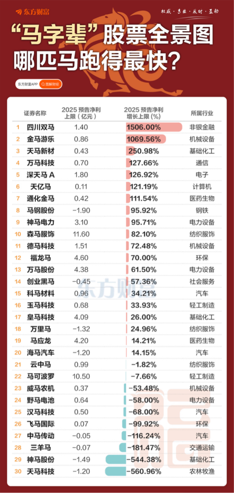 乙巳蛇年即将结束,丙午马年踏步而来。据东方财富Choice数据,截至2月5日,A股市场证券名称中含“马”的股票共有30只,其中市值最大的是马可波罗,为318亿元,市值最小的是科马材料,为30亿元,市值中位数为88亿元。目前“马字辈”股票2025年业绩预告已全部披露完毕,那么在这些股票中,哪匹“马”跑得最快呢?#炒股日记# #复盘记录# #强势机会# #周度策略#