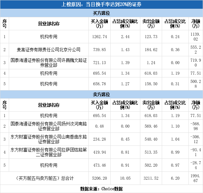 龙虎榜数据显示,今日共5个机构席位出现在龙虎榜单上,分别位列买一、买四、买五、卖一、卖五,合计净买入1688.07万元,占龙虎榜净买额的84.63%。除此之外还有北京君正、光启技术、海科新源等33只个股榜单上出现了机构的身影,其中15家呈现机构净买入,获净买入最多的是北京君正,净买额为2.51亿元;18家呈现机构净卖出,其中遭净卖出最高的为海科新源,净卖额为1.42亿元。