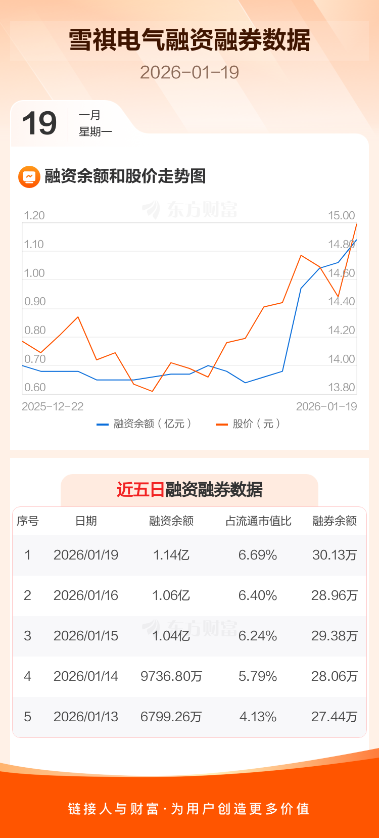 交易所最新数据显示,雪祺电气于2026年1月19日获融资买入1571.02万元,融资偿还710.15万元,当日融资净买入860.88万元。目前,该股融资余额1.14亿,占流通市值比例为6.69%。
