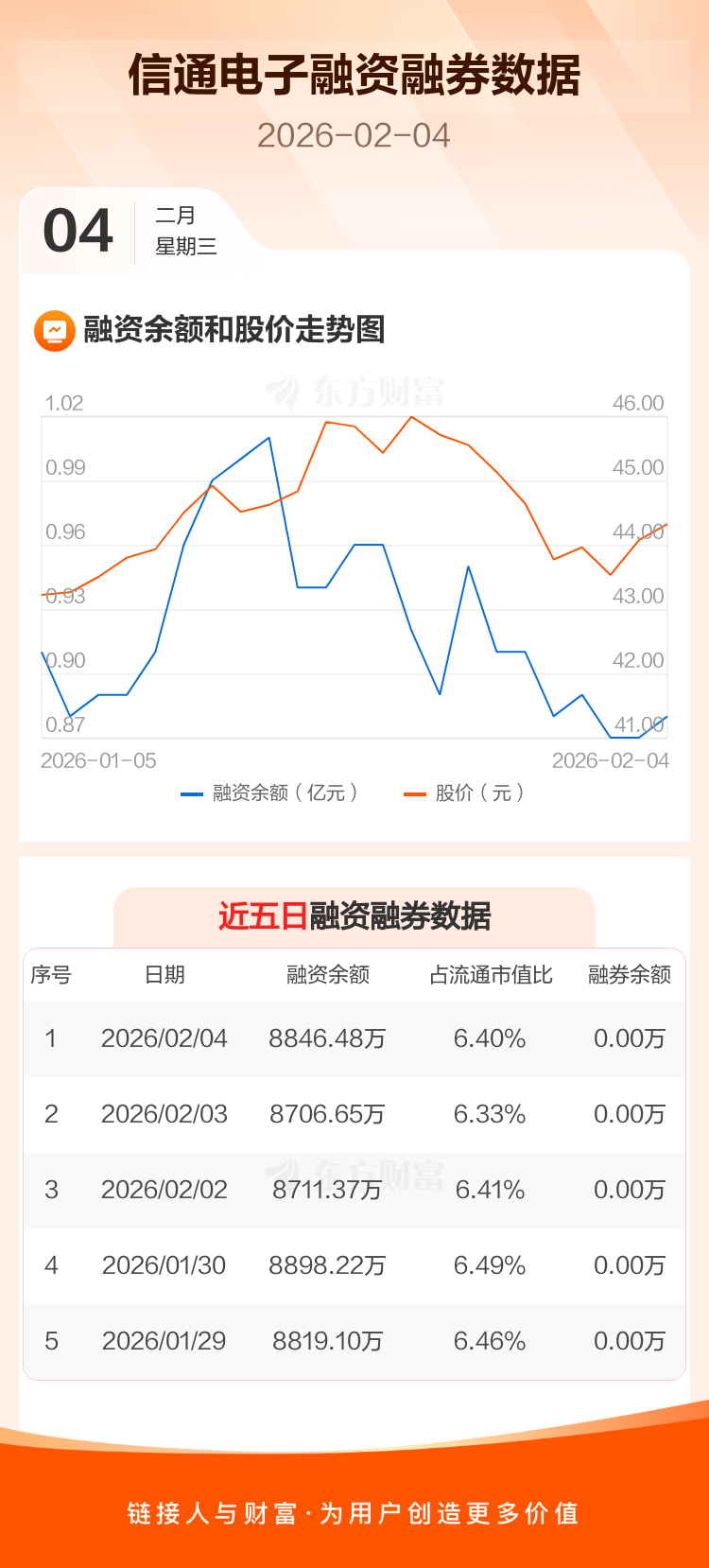 交易所最新数据显示,信通电子于2026年2月4日获融资买入532.04万元,融资偿还392.20万元,当日融资净买入139.83万元。目前,该股融资余额8846.48万,占流通市值比例为6.40%。